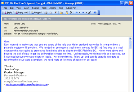 A thoughtful colleague at Dorman made sure my boss (and her boss) knew about the extra effort I put forth, trying to find a time and money saving solution to a problem caused by software malfunction in the shipping department. (Thanx for noticing and taking time to send this note, Sandra.)